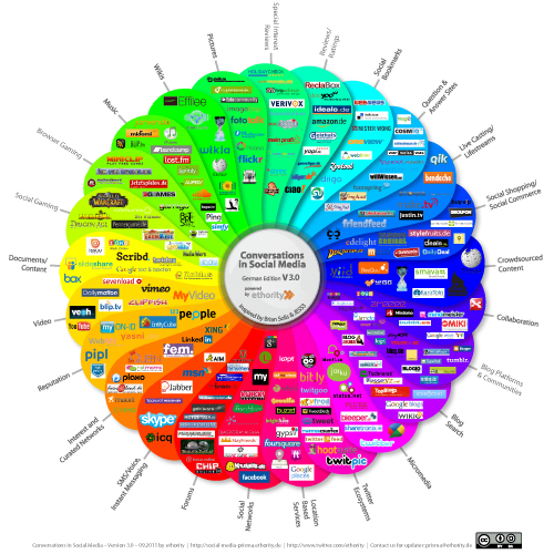 Sogar das deutsche Karrierenetzwerk XING hat einiges überarbeitet und ist mit erweiterten Statusmeldungen und Kommentarfunktion den internationalen Netzen ähnlicher geworden. Dazu kamen ständig neue Dienste, Plattformen und Funktionen wie Mitte 2011 Google Plus. Das Spektrum an Websites explodierte förmlich. Glaubst du nicht? Na, dann schaue dir die folgende Grafik von ethority mal etwas genauer an. So sieht Social Media 2011 aus: