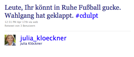Dabei war der Kurznachrichtendienst nicht zum ersten Mal schneller, als es offiziellen Stellen lieb war. Auch von Horst Köhlers Wahl zum Bundespräsidenten erfuhr die Twitter-Gemeinde zehn Minuten früher, als der Rest der Nation. Der SPD-Abgeordnete Ulrich Kelber postete das Ergebnis per Handy noch vor der offiziellen Verkündung. Seine Kollegin Julia Klöckner aus dem konservativen Lager zog nur wenige Minuten später nach.